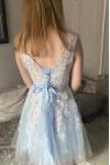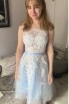 Comentarios de clientes: Vestidos de fiesta cortos Vestidos De Fiesta Azul Claro Con Faja Sin Espalda Línea-A Apliques De Encaje Longitud De Rodilla Vestidos De Bienvenida De Tul