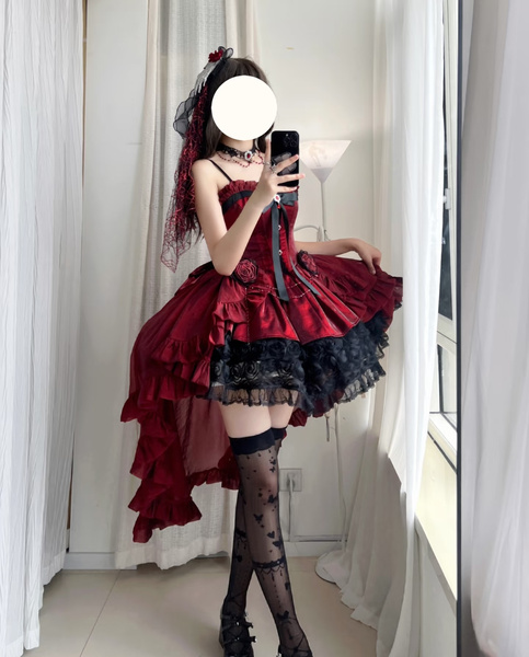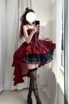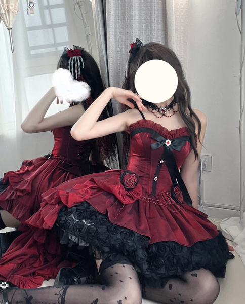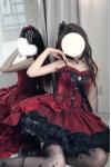 Robe Lolita Gothique Rouge et Noire Décolleté Cœur Sans Bustier Volants Nœuds Robe Lolita Courte