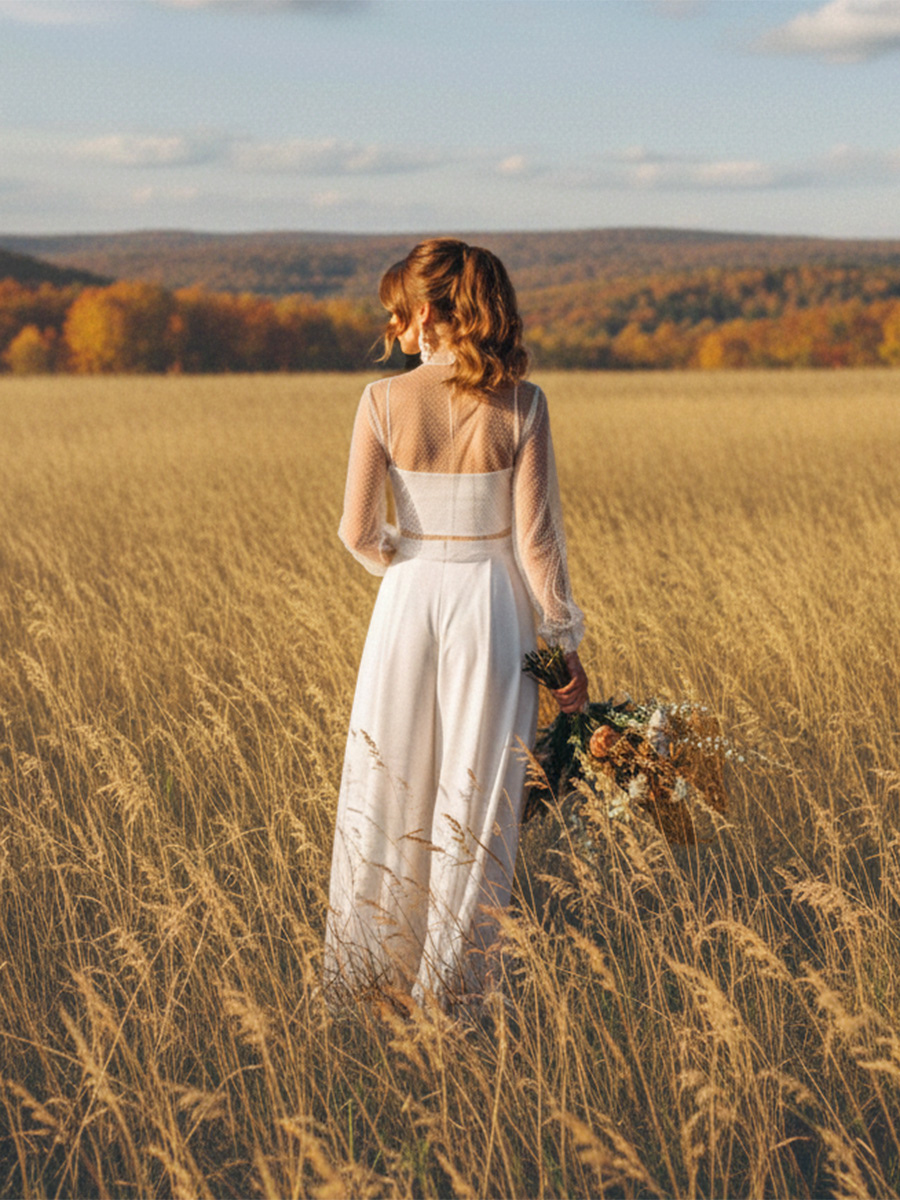 Completo da sposa in 3 pezzi con pantaloni in pizzo e chiffon con scollatura trasparente con cerniera maniche lunghe lunghezza al pavimento