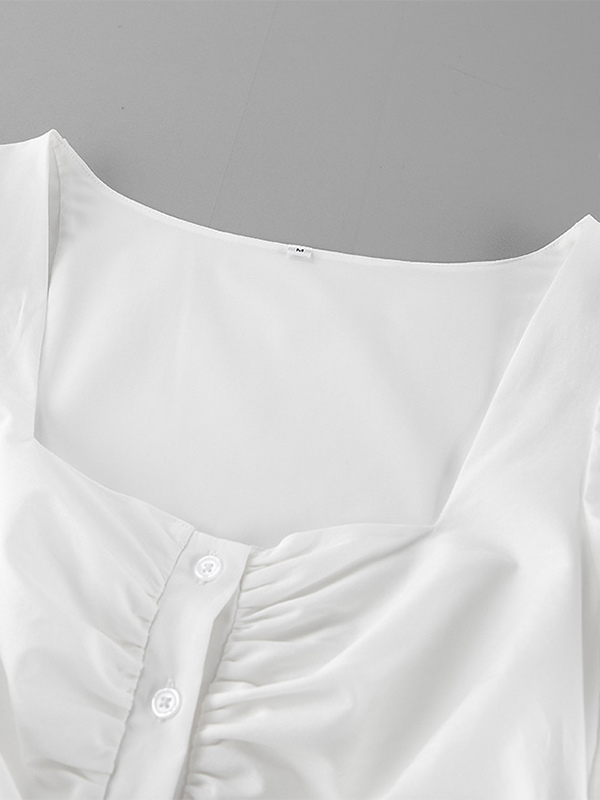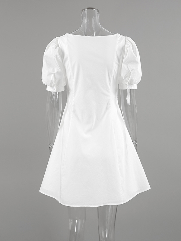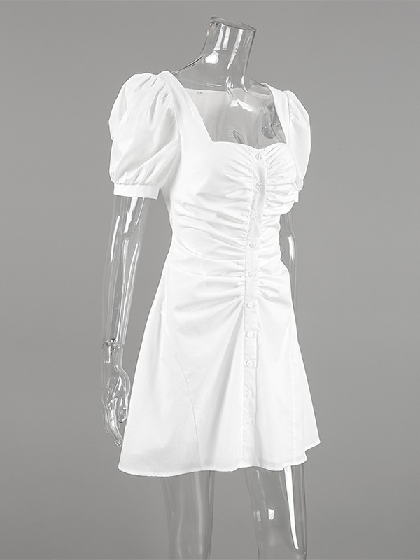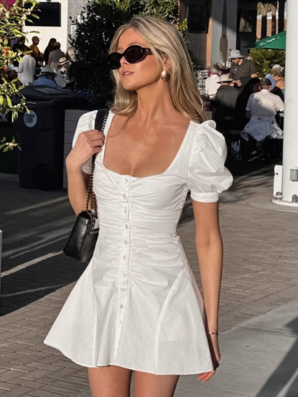 Breathable Cotton Mini Dress Women - White Cottagecore Puff Sleeve Ruched Square Neck - Summer Garden Party Date Night 2026