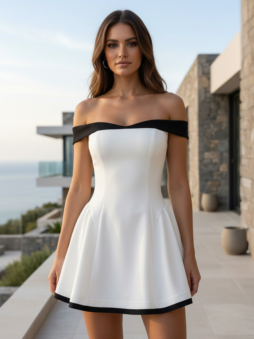 Embrace a blend of classic and modern style with this striking two-tone off-shoulder mini dress. This piece is designed to offer a flattering silhouette and a touch of playful sophistication, making it a versatile addition to your wardrobe.